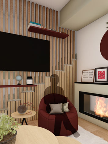 Cet aménagement intérieur contemporain met en valeur une ambiance chaleureuse et équilibrée, portée par une palette de tons naturels mêlant bois clair, beiges doux, verts subtils et touches contrastées. Les volumes sont structurés par des panneaux muraux, des claustras en bois et des textures minérales qui apportent rythme et profondeur aux espaces.