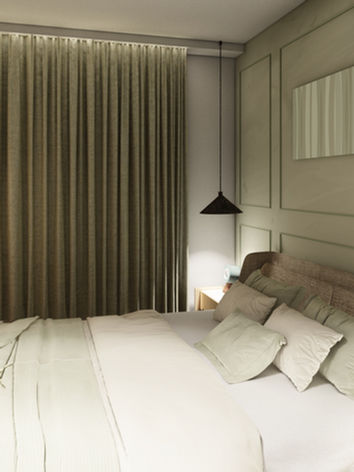 La chambre privilégie une atmosphère douce et intime, avec un mobilier aux lignes simples et une lumière maîtrisée. L’entrée, pensée comme un espace de transition élégant, joue sur les formes géométriques et les effets de symétrie pour renforcer la luminosité et la perception des volumes.