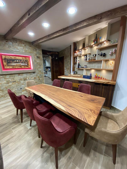 Ce bar sur mesure marie le charme du bois brut à une structure contemporaine. Le comptoir en bois massif aux lignes organiques contraste élégamment avec le mobilier vertical aux finitions bois foncé rayé. Les étagères flottantes, rythmées par des montants blancs, créent un jeu graphique tout en légèreté, mettant en valeur les bouteilles et verres exposés.